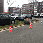 Lösung: da es sich um eine stark frequentierte Parkplatzfläche handelt, führten wir zunächst Verkehrssicherungsmaßnahmen durch, um Folgeunfälle zu verhindern. Zunächst waren wir etwas ratlos, wie dieses Problem angegangen werden könnte und zugegeben, die eine oder andere verrückte Idee war dabei. Nach einer kurzen Beratschlagungsphase war dann jedoch schnell eine Lösung gefunden: ein auf dem benachbarten Grundstück ansässiger Hersteller von Baumaschinen zählt zu unserem Kundenkreis. Nach einem kurzen Hilferuf per Telefon kam dann auch sehr schnell tatkräftige Unterstützung. Mittels eines mit Palettengabeln ausgerüsteten Radladers konnte der Findling wieder an seinen angestammten Platz verfrachtet werden. Vielen Dank nochmals an die Helfer für die unkomplizierte Hilfe!