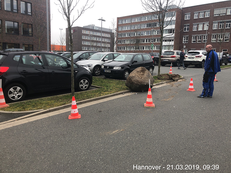 Aufgabe: auf dem Gelände unseres Kunden hatte ein LKW-Fahrer offenbar die Größe seines Fahrzeugs unterschätzt und beim Rangieren einen ca. 1,5t schweren Findling mit seinem Fahrzeug aus einem Grünstreifen herausgerissen. Zu allem Überfluß schleifte er den Stein dann auch noch über fünf Meter weit mit, bis dieser dann auf der Fahrbahn liegen blieb. Ohne sich weiter um den Vorfall zu kümmern, entferne sich der Fahrer vom Ort des Geschehens. Früh morgens informierte uns unser Kunde über den Vorfall und bat uns, uns der Sache anzunehmen.